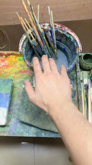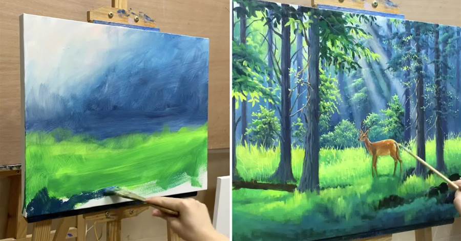 照片里,陽光透過密林的層層枝葉,灑在麋鹿身上,與青草地的蔥綠交織成和諧的畫面。麋鹿在孤獨中游走,但并不感到寂寞。這種寧靜之感,如何通過色彩和筆觸傳遞,成了一個有待探索的技法懸念。