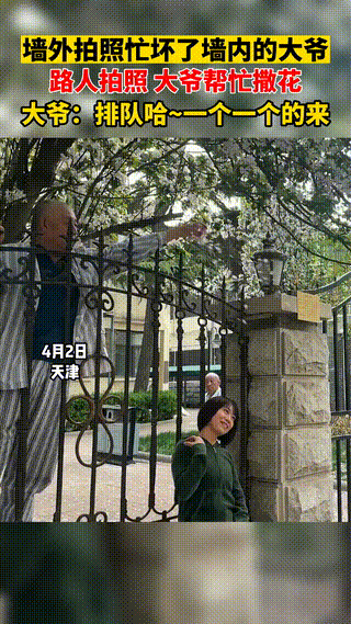 視訊中,一位生活在墻內的大爺成為了網紅場景中的最佳配角。只見他熱情地幫助拍照的路人撒花,絲毫不輸專業的氣氛組,大爺的撒花動作不僅嫻熟,而且充滿了節奏。隨著大爺的一聲聲「排隊哈~一個一個的來」,現場的流量瞬時間爆滿。可是這位大爺為何如此賣力地撒花呢?究竟是什麼吸引了這麼多的游客駐足呢?這些懸念都在等待你去揭曉。