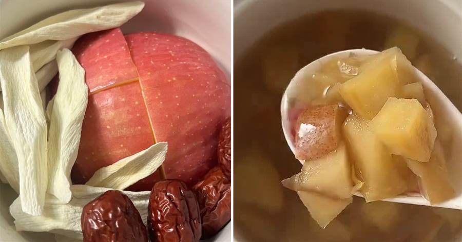 食材包括蘋果、梨子、紅棗、山楂和山藥,主要是健脾養胃,生津止渴,對夏季積食有幫助。先用鹽洗凈蘋果和梨,連皮一起煮。紅棗提味,要去核避免澀味。煮好后可以搗碎紅棗肉增加湯的濃度,或者用破壁機攪拌得細膩一點,寶寶能當粥喝,家人也能享用。