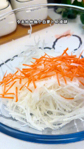 先將白蘿卜擦成絲,加點鹽殺出水分,然后沖干水分。再放入一包無鹽蝦皮,這樣能夠補充鈣質,并增添鮮味。接著,加點小蔥花來提香,打入兩個雞蛋,與低筋面粉混合均勻。平底鍋刷上少量的油,把面糊攤成小圓餅,小火慢煎,直到兩面金黃,香味四溢。